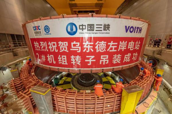 烏東德水電站是實施“西電東送”的國家重大工程,電站共安裝12臺單機容量85萬千瓦水輪發電機組,總裝機容量1020萬千瓦,其中8臺機組已于2020年投產發電。此次吊裝的2號機組轉子直徑17.49米,高度4.07米,由中心體、扇形體支架、磁軛及磁極組成,是烏東德水輪發電機組最重、最核心的部件之一,也是目前世界上在建水電站中最大的機組部件之一。
